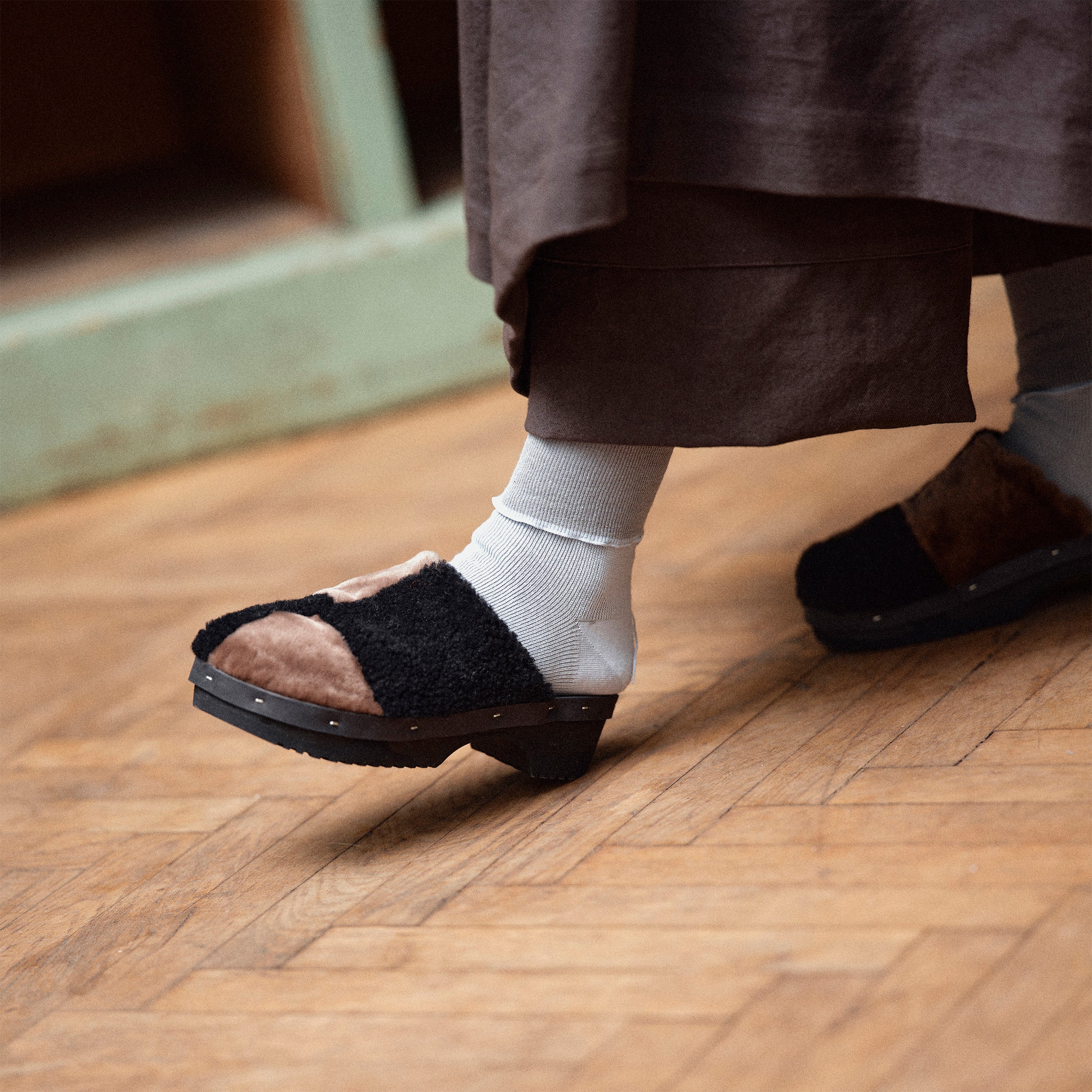 PANTO CURLY PATCHWORK + Shearling Clogs + Black Brown
